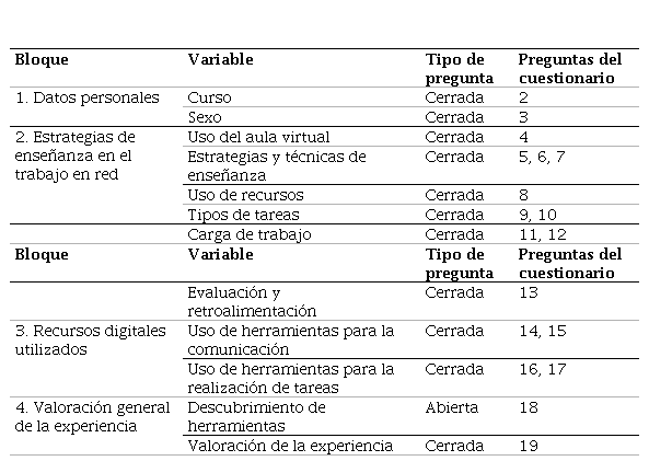 Partiendo de la idea de analizar las distintas percepciones de un grupo concreto, ante una nueva realidad (cambio de la situación educativa), en un momento concreto (confinamiento), se ha procedido, por tanto, a realizar un análisis descriptivo de tipo no experimental, siguiendo la clasificación de Hernández et al. (2003), a través de un cuestionario. La elaboración del instrumento para la recopilación de información, ha requerido de un análisis previo de cada uno de los puntos que lo conforman: educación virtual/online: e-learning (definición, características, figura del profesorado y del alumnado, competencia digital docente, ventajas e inconvenientes de la educación virtual), entornos de enseñanza en red y las TIC en el aprendizaje online. Este marco teórico ha sido un eje clave a la hora de estructurar los 17 ítems cuestionados, los cuales han sido categorizados en cuatro bloques distintos de información.