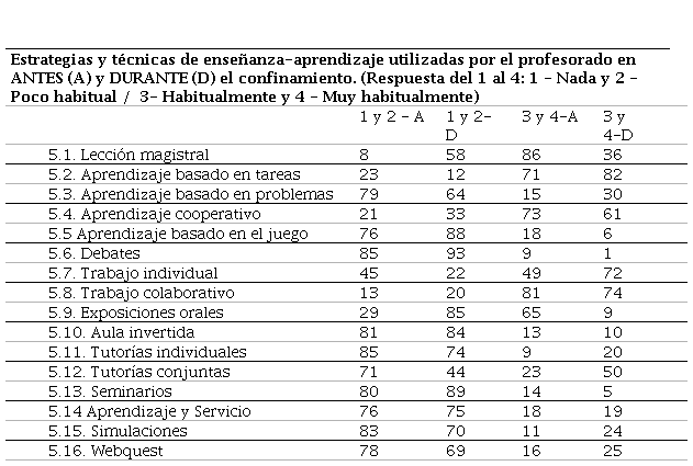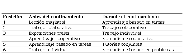 En cuanto a la percepción del alumnado con respecto a las estrategias y técnicas de enseñanza llevadas a cabo por los docentes se han percibido cambios. Valorando las estrategias y técnicas más utilizadas tanto antes como después del confinamiento, es destacable que, de manera presencial, la estrategia más utilizada antes del confinamiento fue la lección magistral, sin embargo, en la modalidad online la más utilizada fue el aprendizaje basado en tareas. En una segunda posición, tanto antes como durante el confinamiento, la estrategia más utilizada ha sido el trabajo colaborativo. Casado (2000) ya hacía referencia en como el modelo educativo basado en las tecnologías puede ofrecer oportunidades de aprendizaje en donde los participantes desarrollan un papel fundamental en el proceso de aprendizaje.