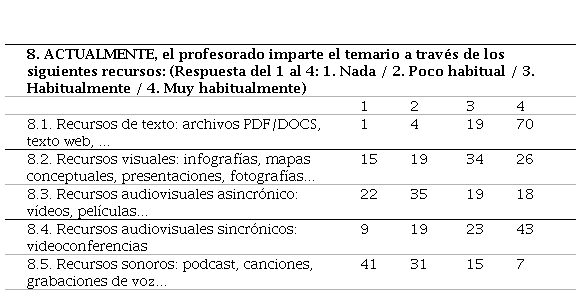 Los contenidos a impartir por el profesorado se han presentado en diferentes tipos de recursos como podemos visualizar en la Tabla 4. El tipo de recurso más compartido en la modalidad online ha sido en formato textual (PDF/DOCS, texto web…), así lo han expresado una frecuencia de 70 estudiantes; además 43 estudiantes han indicado que los audiovisuales sincrónicos también han sido muy habitualmente utilizados por el profesorado. En el otro extremo, los recursos menos empleados por los docentes han sido aquellos sonoros (podcast, canciones, grabaciones de voz…).
