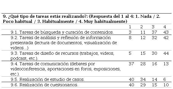 En cuanto a las herramientas, destaca que la gran mayoría del profesorado ha utilizado documentos de base textual para proporcionar la información al alumnado, por lo tanto, el diseño de recursos de tipo multimedia y aprovechar otro tipo de elementos icónicos y de sonido en los recursos educativos resultaría interesante. También resultaría interesante incrementar tareas que implique la comunicación entre el alumnado en entornos digitales, como debates en videoconferencia o foros, exposiciones, etc.