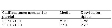 A partir de la información dada por el alumnado a través del grupo focal se analiza la diferencia significativa de las calificaciones del primer parcial de teoría con las del alumnado de 2019-2020. Se obtienen las calificaciones medias y la desviación típica mostradas en la Tabla 9.