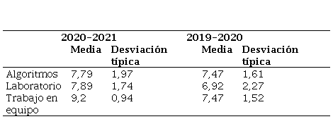 Las calificaciones medias obtenidas en cada parte de la asignatura de los dos cursos a contrastar se muestran en la Tabla 3.