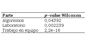 Se observa que en las calificaciones de algoritmia hay diferencias significativas (p-value menor que 0,05) pero con un grado de significancia menor que en los bloques de trabajo en equipo y laboratorio, ambos con un p-value menor que 0,01.