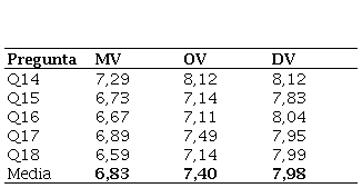 La Figura 4 muestra de forma gráfica los diferentes valores (MV, OV y DV) para cada pregunta.