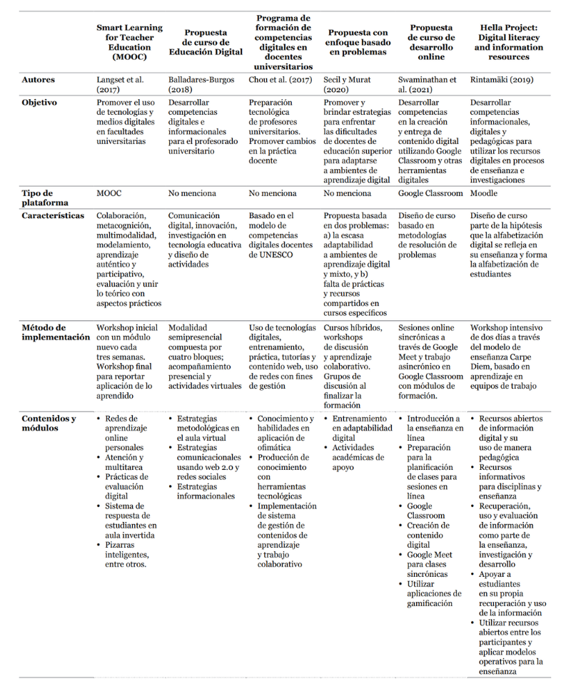 A continuación, la Tabla 1, muestra una síntesis comparativa de las propuestas de programas de formación en competencias digitales docentes antes presentadas.