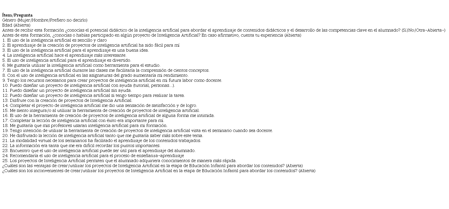 Como instrumentos de recogida de información, para valorar el grado de utilidad de la IA en la formación superior se elaboró un cuestionario (Tabla 1), a partir de Martínez y Fernández (2018); Moreno-Martínez (2019); Barroso et al. (2016) y Fernández-Robles (2017), con datos sociodemográficos, 25 ítems en escala Likert (1 totalmente en desacuerdo y 5 totalmente de acuerdo) y 5 preguntas de carácter abierto en torno a su experiencia académica y las ventajas e inconvenientes del uso de la IA en la etapa de Educación Infantil. La fiabilidad se calculó mediante el coeficiente alfa de Cronbach para todos los ítems. La consistencia total del cuestionario es satisfactoria (0.930) atendiendo a Gutiérrez-Castillo et al. (2016) y Bisquerra (2014). Se observa que no mejoraría con la eliminación de algún ítem del cuestionario.