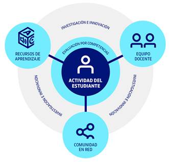 La UOC se caracteriza por un modelo educativo propio que sitúa la actividad del estudiante en el centro (Figura 1), garantizando su aprendizaje activo, la flexibilidad, la personalización y la interactividad, así como el trabajo colaborativo. Todo ello con el apoyo de la tecnología y la constante investigación en e-learning.