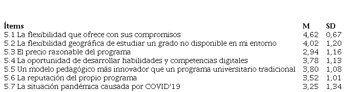 En la siguiente Tabla se evidencia que los ítems 5.1 y 5.2 recibieron puntuaciones más altas. Este hecho constata que la flexibilidad es el factor más importante que motiva a los estudiantes a estudiar en línea, aspecto que constituye una de las principales ventajas de la digitalización de una institución universitaria.