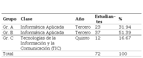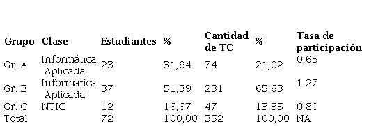 En relación con los grupos de estudiantes participantes (Gr. A, Gr. B y Gr.C), los resultados muestran que los estudiantes más activos en la producción de TC correspondieron al Grupo B. Este grupo, además de ser el más numeroso, es el que mayor nivel de representatividad tiene sobre la producción de TC. El detalle de la participación por grupos se muestra en la Tabla 9.