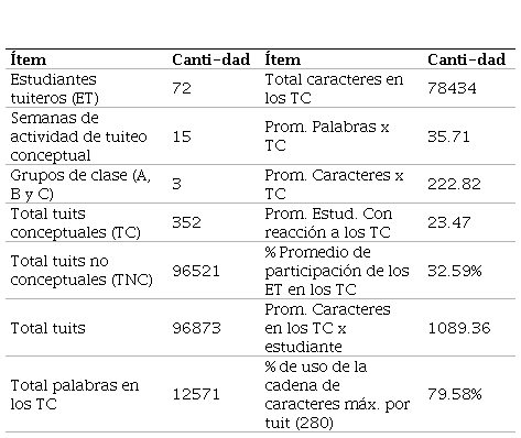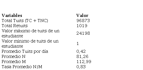 Para el proceso de extracción de tuits desde la categoría Contenedor, se utilizaron tanto los TC como los tuits que producían los estudiantes en su actividad normal en Twitter (tuits no conceptuales o TNC). La estrategia consistió en el estudio demográfico del comportamiento de la cuenta de cada estudiante en el periodo de tiempo en el que se llevó a cabo la generación de TC. Para ello, se utilizó el programa en línea Twitonomy y se analizaron las siguientes variables: total de tuits generados, porcentaje de respuesta a otros tuits (retuits), número de seguidores (N), número de personas seguidas (M), día de mayor actividad, hora de mayor actividad y plataforma de tuiteo.