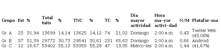 Por último, se muestra el análisis comparativo de la actividad de tuiteo para los 3 grupos (Gr. A, Gr. B y Gr.C). Los datos de la Tabla 13 reflejan que el grupo que más intervino en la producción de tuits fue el Grupo B con más del 50 % de la participación. En relación con su condición de usuarios que siguen o son seguidos por otros, el grupo que mejor participación tuvo fue el Grupo C (N/M=1,44).