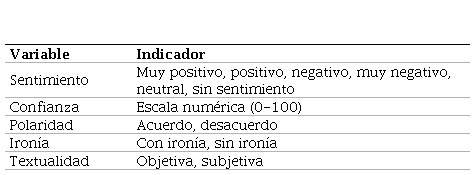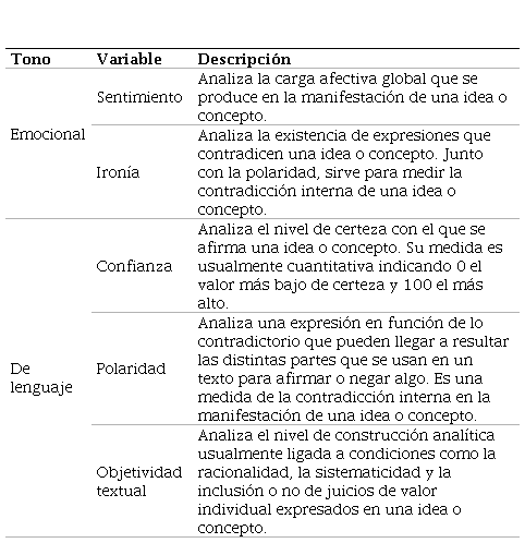 Para el proceso de extracción y sistematización de tuits desde la categoría Contexto, se utilizaron nuevamente los TC y la estrategia del análisis del tono emocional y de lenguaje a partir de 5 variables: sentimiento, confianza, polaridad, ironía y objetividad textual. Cada una de estas variables se midió en términos de los indicadores señalados en la Tabla 5. El estudio de los tonos se llevó a cabo con la API Sentiment Analysis que hace parte del programa en línea Meaning Cloud.
