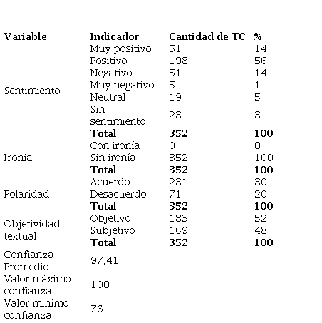 En la investigación, se llevó a cabo el análisis del 100 % de los TC (n=352) que produjeron los estudiantes. Como se observa en la Tabla 15, la generación de TC tuvo tendencia a producirse desde sentimientos positivos (n>69 %), con una polaridad predominantemente valorada como de acuerdo; por otra parte, la textualidad fue calificada principalmente como objetiva (n=52 %) aunque sin distar mucho de su opuesta, la textualidad subjetiva. Todo lo anterior se produjo en un contexto sin ironía manifiesta. Entre tanto, el promedio de confianza se ubicó en un rango muy alto (n>97) con valores en todos los TC por encima de 75.