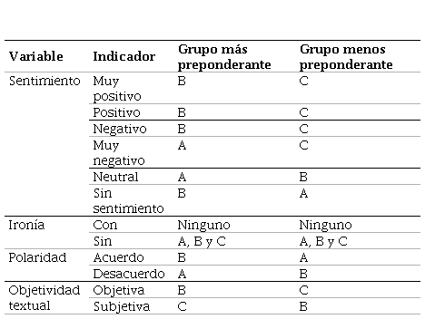 En relación con los grupos, se observa en la Tabla 16 una fuerte influencia del Grupo B en la determinación de la variable Sentimiento, ubicándose como grupo más destacado en al menos tres indicadores, especialmente los que determinan la condición positiva. Entre tanto, para esta misma variable, el Grupo C se presenta como el de menor relevancia en 4 de los indicadores. Para la variable Polaridad, el grupo que mayor nivel de polaridad positiva presentó fue nuevamente el Grupo B mientras que el Grupo A se muestra como el de mayor polaridad negativa. En términos de la Objetividad textual, el Grupo B se destaca por ser el que moviliza el conjunto de TC hacia la objetividad, mientras que el Grupo C lo hace hacia la subjetividad. El nivel de Ironía detectado en todos los grupos es nulo.
