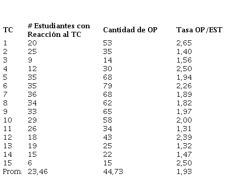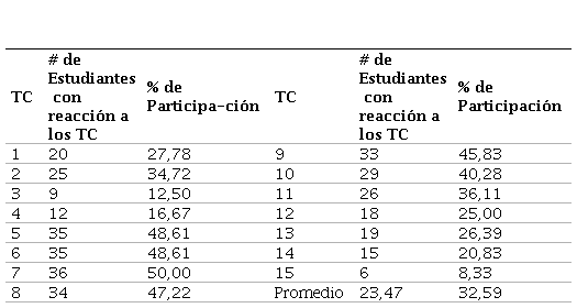 Bajo esta categoría, se tomaron los tuits que produjeron los estudiantes como reacción a las preguntas que el docente publicó con el propósito de indagar por algunos de los conceptos abordados en clase. A estos tuits, se les denominó tuits conceptuales (TC). Para cada TC, el número de estudiantes que reaccionó fue distinto por cuanto la participación de ellos se realizó de forma voluntaria durante toda la investigación. Al respecto, el detalle de la participación de los estudiantes se muestra en la Tabla 6.