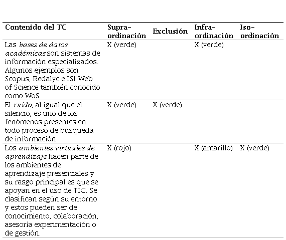 De esta forma, cada TC producido por los estudiantes (n=72) fue entendido como un conjunto de Oraciones Proposicionales (OP) que daban cuenta de la comprensión de un concepto. Estas OP se fueron registrando en una matriz en la que se indicaba si ellas reflejaban una supra-ordinación, una exclusión, una infra-ordinación y/o una iso-ordinación. Adicionalmente, se fue señalando con un código de colores (véase a modo de ejemplo la Tabla 4) si las OP eran correctas (verde), parcialmente correctas (amarillo) o incorrectas (rojo).
