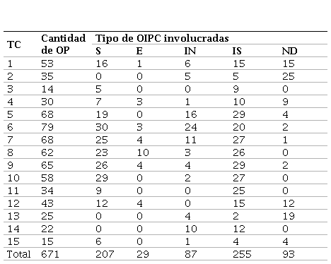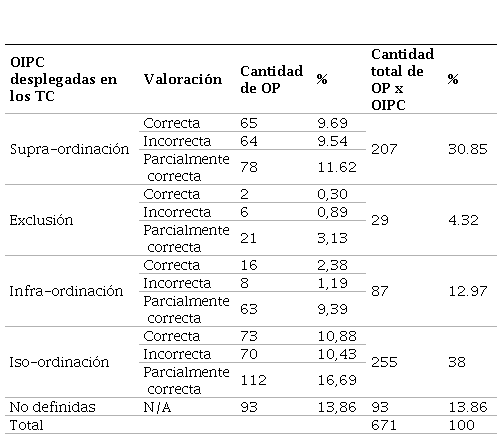 Algunas de las oraciones no se catalogaron bajo ninguna OIPC por lo cual se les designó como no determinadas (ND). Por otra parte, las oraciones proposicionales (OP) fueron evaluadas a partir de tres escalas: correcta, incorrecta y parcialmente correcta; esto para reconocer si el ejercicio de conceptualización que se mostraba en los TC era elaborado adecuadamente. Los resultados se muestran en la Tabla 8.