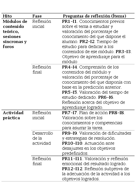 El andamiaje metacognitivo basado en diarios de aprendizaje diseñado en la asignatura parte de varios modelos teóricos acerca del aprendizaje autorregulado. Por un lado, toma del modelo de autorregulación de Zimmerman (2000), basado en tres fases: (1) Fase previa; (2) Fase de realización y; (3) Fase de autorreflexión. Por otro, el modelo de aprendizaje autorregulado de Winne (2001), que adopta como elemento principal la monitorización constante del proceso de aprendizaje, en el que intervienen cuatro fases: (1) Definición de la tarea; (2) Planteamiento de metas; (3) Actuación y; (4) Adaptación. A partir de estos modelos y tomando como referencia la propia estructura de la asignatura, se han definido las fases a partir de los modelos citados, de forma alineada a los hitos más importantes en relación con los contenidos teóricos y las actividades prácticas. Se plantea, pues, una estrategia de reflexión inicial (antes de empezar cada módulo) y reflexión final (al concluir cada módulo) con los ítems que se muestran en la Tabla 1. Respecto a las tres actividades prácticas diseñadas en la asignatura, el alumnado también completa una serie de preguntas de reflexión para cada una de ellas, divididas en esta ocasión en tres fases (Tabla 1).