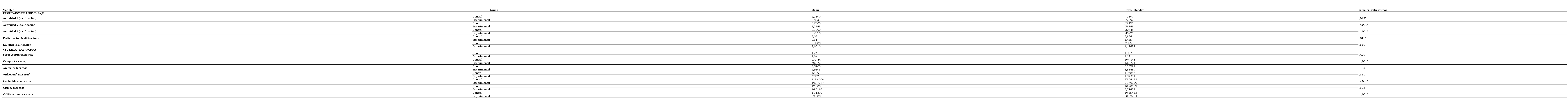 Con los datos obtenidos se realiza un Análisis de Varianza de un Factor (ANOVA) con cada una de las variables correspondientes a los resultados de aprendizaje y al uso de la plataforma, comparando los grupos de estudio. Los resultados del análisis correspondiente al contraste de hipótesis para igualdad de medias entre grupos (que es la hipótesis de partida para todos los casos) se muestran en la Tabla 3.