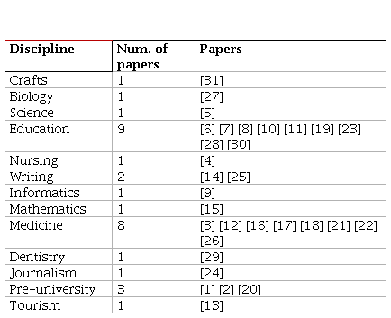 The field of education, understood as a cross-disciplinary field, is the most represented in the corpus of the review, with nine articles (29%), followed by medicine, with eight articles (25.8%). The organisation into disciplinary fields can be seen in Table 3.