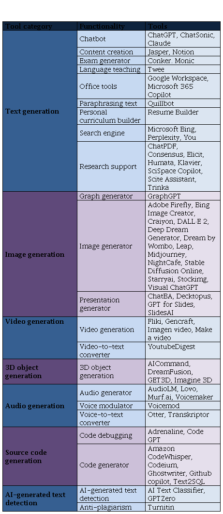 Regardless of the increasing number of multimodal tools that transform various types of inputs into different types of outputs, to understand the current landscape concerning the educational context, they can be classified into tools that primarily generate text, images, videos, 3D objects, audio, source code, and tools for detecting AI-generated text. Within each category, different functional subcategories have been established (see Table 1).