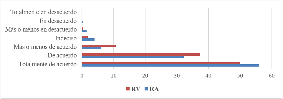 Resumiendo, el 97.70 % y el 94.29 % de los participantes considera la app de RV y la app de RA, respectivamente, válida para el aprendizaje (porcentaje acumulado respecto a su utilidad de totalmente de acuerdo, de acuerdo y más o menos de acuerdo). La Figura 6 ilustra los resultados de este análisis.
