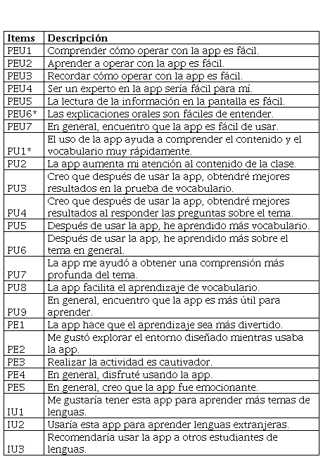 Un cuestionario de experiencia del usuario basado en el modelo de aceptación de tecnología (TAM; Davis, 1989; Romano et al., 2020), fue adaptado a nuestro estudio para observar la percepción del estudiante en referencia a cuatro aspectos fundamentales: la facilidad de uso (PEU = perceived ease of use); el disfrute durante su uso (PE = perceived enjoyment); la utilidad (PU= perceived usefulness) y la intención de uso (intention to use = IU).