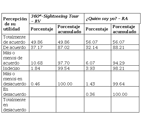 Dando respuesta a la primera cuestión planteada (Q1), los estudiantes coinciden en que la mayor ventaja de utilizar tanto la app 360º- Sightseeing Tour como la app ¿Quién soy yo? es aprender más (PU7) y más rápido (PU1). La Tabla 2 sintetiza los resultados globales obtenidos con respecto al potencial de aprendizaje y a la utilidad de las apps: desde el 49.86 % de los estudiantes que considera la app de RV muy útil, 56.07 % en el caso de la app de RA, hasta el porcentaje de estudiantes que considera las apps más o menos útiles, 10.68 % para RV y 6.07 % en el caso de RA. Ningún participante opinó que eran poco útiles o inútiles.