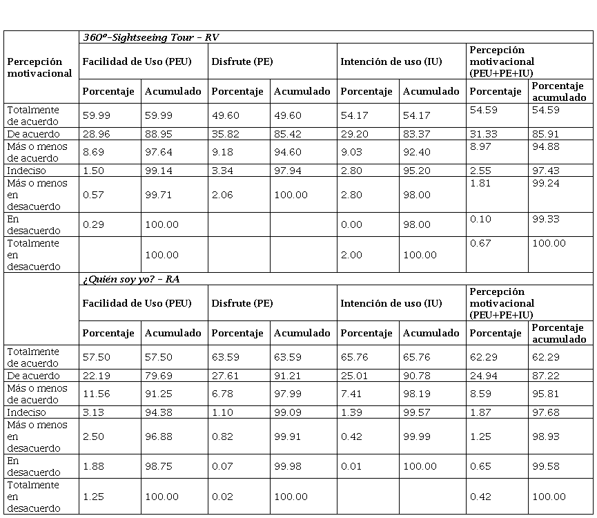Su facilidad de uso (PEU). Resultando la app de RV incluso más fácil y manejable que la de RA. El 97.64 % manifestó la facilidad de uso de 360º-Sightseeing Tour, mientras que desciende a un 91.25 % los que consideran fácil de usar ¿Quién soy yo?