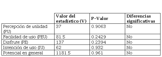 Con la finalidad de extender este análisis y poder tomar decisiones futuras, hemos contrastado las posibles diferencias entre ambas apps con respecto a su potencial educativo y motivador, respondiendo a la tercera cuestión del estudio (Q3). El test de Wilcoxon (Tabla 4) nos lleva a concluir que no existen diferencias significativas ni en la percepción con respecto a su utilidad (P-valor 0.9063), ni en ninguno de los aspectos que conforman el potencial motivador (P-valores 0.2429, 0.2394 y 0.932 para la facilidad de uso (PEU), el disfrute (PE) y la intención de uso (IU) respectivamente). Si consideramos el potencial de las herramientas de forma global, tampoco se detectan diferencias significativas (P-valor 0.961).