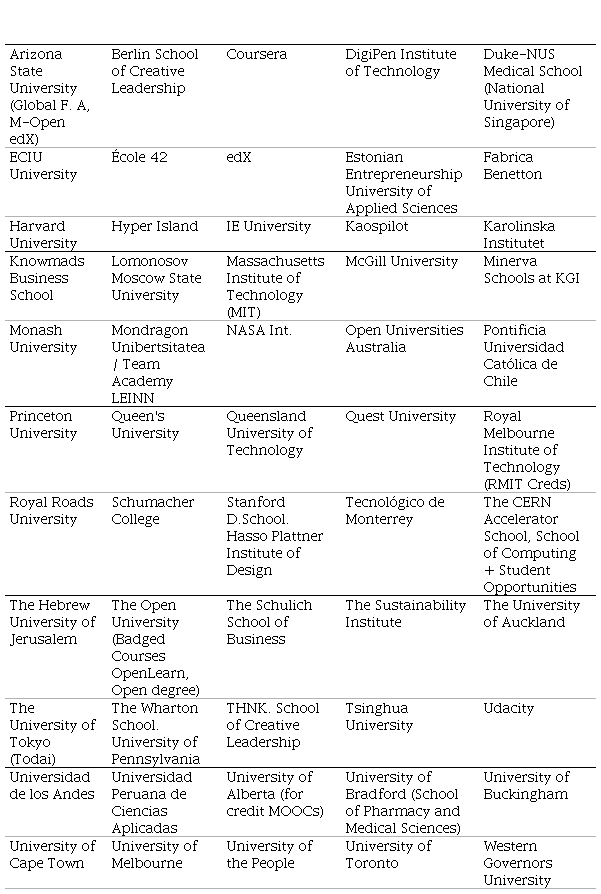 Durante el proceso de extracción de datos se codifica y categoriza la información recogida, empleando técnicas de análisis de contenido, con el fin de identificar tendencias en el sistema educativo superior, que nos ayudan a detectar instituciones con prácticas que sean susceptibles de ser consideradas singulares. En el transcurso de la indagación se identifican 25 tendencias (Tabla 1) vinculadas con 110 instituciones de Europa, Estados Unidos, Canadá y Australia, además de organizaciones de carácter supraterritorial. En el proceso de análisis se observa que varias universidades mencionadas en los documentos de referencia son consideradas instituciones inspiradoras para otros centros, lo cual nos conduce a redimensionar el universo de universidades a 55 centros que terceros consideran líderes competitivos en el sistema universitario mundial (Tabla 2).
