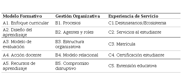 Esta dimensión se sustenta en la definición proporcionada por la OCDE y Eurostat (2005), que describe la innovación como la implementación de un producto (bien o servicio), proceso o método de marketing u organizativo nuevo o significativamente mejorado en las prácticas empresariales, el lugar de trabajo o las relaciones exteriores. En nuestra evaluación, valoramos el componente de innovación presente en cada uno de los factores del elemento, así como el grado de creación (novedad) o adopción de innovaciones que contenían. Buscamos identificar, por ejemplo, la incorporación de nuevos o transformados servicios o productos formativos, enfoques y métodos de enseñanza, organización del trabajo y del personal, integración de tecnologías de la información y la comunicación (TIC) en los procesos educativos, entre otros. El objetivo, por tanto, es verificar que la innovación genera cambios en el modelo de la institución, aportándole un valor diferencial que facilite su adaptación a contextos de cambio acelerado (Marcet, 2016).