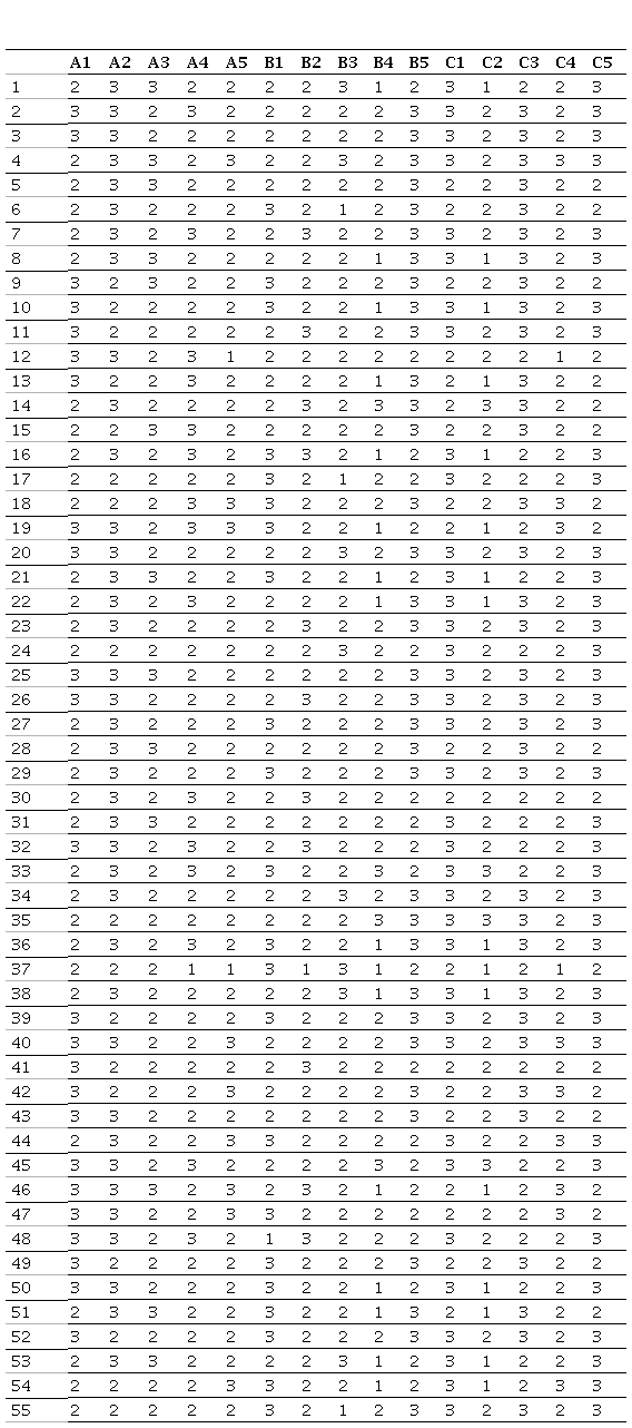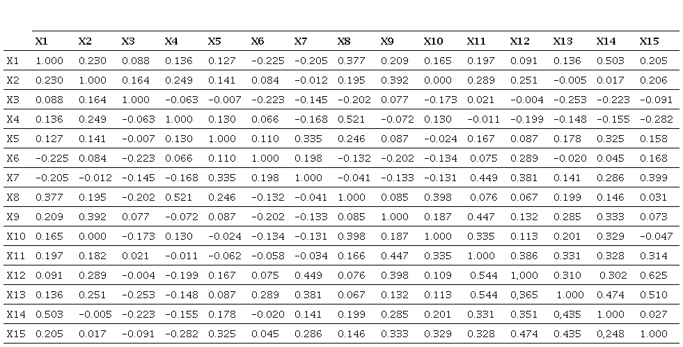 En este caso, hemos aplicado un análisis de componentes principales (Jolliffe y Cadima, 2016) a nuestra base de datos inicial con el objetivo de reducir el número de variables significativas, que inicialmente eran 15. Este análisis nos proporciona un procedimiento para determinar el número de variables que describen de manera adecuada los datos. Utilizando el lenguaje de programación R, calculamos la matriz de correlaciones entre los valores de las 15 variables iniciales, considerando todas las instituciones muestreadas. En los resultados del programa, las variables se etiquetan como X1 a X15, en el orden en que se introdujeron inicialmente, y se agrupan en las categorías A1 a C5. Al examinar directamente esta matriz, no se observan relaciones muy fuertes entre las diferentes variables como se muestra en la Tabla 5. Por lo tanto, no parece apropiado excluir ninguna variable inicial utilizando este criterio, validándose el modelo de análisis propuesto.