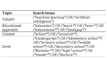 This review, due to its current subject matter, broad scope and to limit the proposed methodology, only studies in English have been analyzed. However, it is possible that there is research in ML and AI applied to education in other languages that have not been considered and that could be of interest.