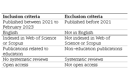 Table 1 shows the search equation according to subject, educational approach, context, and level. For the document search in both databases, this equation is applied to the title, abstract and keywords. In WoS, "TS" is applied to the equivalent formula (title, abstract, and keywords) and in Scopus, the equivalent of "TITLE-ABS- KEY". The design of the search terms as well as the inclusion and exclusion criteria (Figure 1) are based on the recommendations by Zawacki-Richter et al. (2020), for systematic reviews focused on educational research, as well as the indications from Marín (2022) for educational technology research.