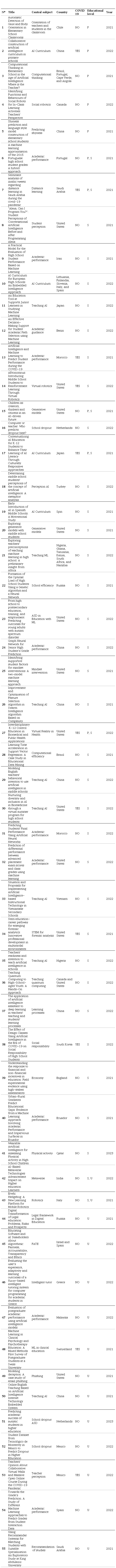 Table 3 presents the studies selected in this review, specifying the title, central subject, context of application, country, or countries in which the research was implemented, whether it covered the COVID-19 topic, educational level, or levels at which the study was applied and the year of publication. (P: Primary), 2. (P, S: Primary, Secondary), 3. (S: Secondary), 4. (S, U: Secondary, University) 5. (U: University).