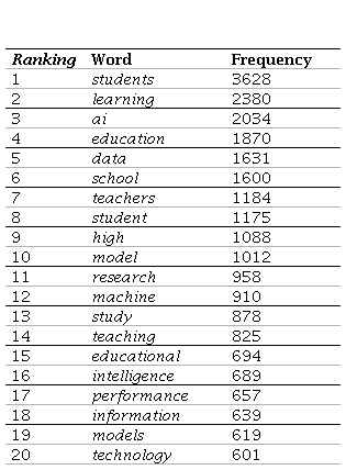 To quantitatively establish the ranking of the word cloud, Table 4 shows the 20 most frequent words in our word cloud. According to the ranking, the words "students", "learning" and "ai" (abbreviation for artificial intelligence) are the three most frequent words, indicating that the selected studies have a high ratio of application of smart tools in education.