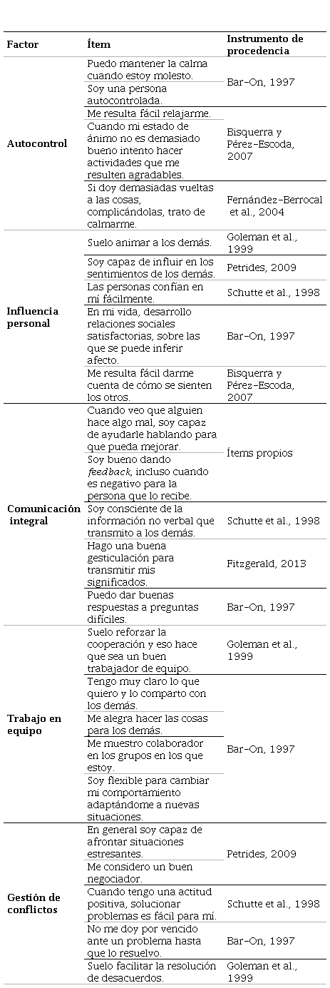 La Tabla 1 se compone de ítems constitutivos de instrumentos que se tienen por referentes en la Inteligencia Emocional, tan solo se aportan dos ítems propios relacionados con dar feedback ya que esta cuestión no estaba cubierta rastreando los cuestionarios comentados ya existentes. La Tabla 1 reporta los factores, sus ítems constitutivos, así como el origen de estos. De forma coherente con todos los cuestionarios utilizados en este trabajo, el cuestionario resultante responde a la categoría de instrumentos autoinformados, donde el estudiante responde realizando un proceso de introspección personal. Se confeccionó empleando una escala Likert 1-10, donde 1 significa “Totalmente en desacuerdo” y 10 “Totalmente de acuerdo”.