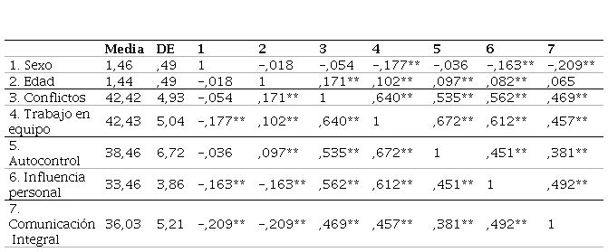 Los valores absolutos de simetría y curtosis se encuentran dentro de los intervalos referidos (0-2 para la simetría y 0-7 para la curtosis), lo que hace posible el empleo de pruebas paramétricas (Curran et al., 1996). La Tabla 2 informa de las medias, las desviaciones estándar, las correlaciones y las significaciones entre variables. Se puede apreciar que la variable control sexo, correlaciona con Trabajo en equipo (r = -0.17, p < 0.01), Influencia personal (r = -0.16, p < 0.01), y Comunicación integral (r = -0.21, p < 0.01). Mientras que la variable edad, muestra diferencias significativas con Gestión de conflictos (r = -0.17, p < 0.01), Trabajo en equipo (r = -0.10, p < 0.01), Autocontrol (r = -0.10, p < 0.01), e Influencia personal (r = -0.08, p < 0.01). Es importante remarcar que las correlaciones entre todas las variables englobadas en la propuesta teórica de este trabajo siempre presentan una alta significación entre ellas.