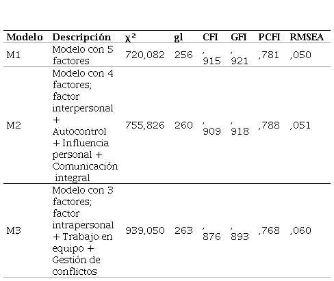 La Tabla 3 aporta un resumen del ajuste de los tres modelos trabajados. Para su confección se considera a Gardner (1983), quien distingue por primera vez entre los planos intrapersonal e interpersonal, aportando una perspectiva más completa del desempeño de las personas. Aglutinando en un único factor los hasta ahora factores pertenecientes al plano interpersonal (Trabajo en equipo y Gestión de conflictos), y dando como resultado un modelo de 4 factores que se corresponde con M2. Asimismo, para conceptualizar M3, se hace a la inversa, es decir, se aglutinan los factores intrapersonales en un único factor (Autocontrol, Influencia personal y Comunicación integral).