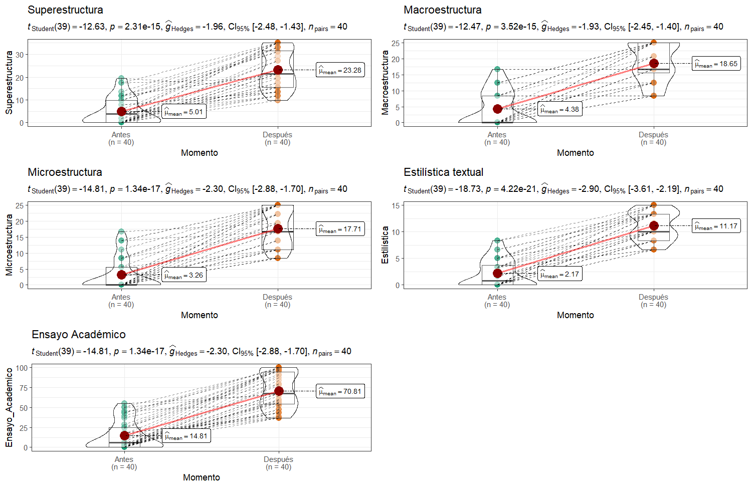 Los resultados del experimento evidencian mejoras significativas en la superestructura, macroestructura, microestructura y estilística textual (p < 0.05; ĝHedges > 1.20), así como en el promedio general del ensayo académico (Figura 3). Estos cambios explican que con la intervención de DTP-AIEC, los estudiantes escriben mejor sus ensayos académicos individuales.