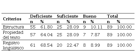 Los resultados permitieron identificar que más del 60 % de los estudiantes presentan dificultades en cuanto a la estructura de sus textos (introducción, desarrollo y conclusión), propiedades (coherencia y cohesión) y registro lingüístico (léxico, sintaxis y ortografía). Alrededor de la décima parte alcanzó una valoración de bueno en cada criterio (Tabla 1).