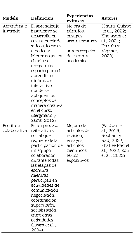 Sobre la base de los resultados del diagnóstico previo, se revisó la literatura en la base de datos de Scopus y Web of Science y se hallaron dos modelos que evidencian alto impacto en la redacción académica: Aprendizaje Invertido y Escritura Colaborativa. Los cambios significativos en la producción de diversos textos a partir de la implementación de estos modelos en las sesiones de aprendizaje se deben al empleo de soporte tecnológico, la participación activa del estudiante y monitoreo del docente. Los diferentes experimentos tuvieron una duración muy variada entre 6 y 11 sesiones con muestras que oscilan entre 24 y 113 estudiantes universitarios (Tabla 2).