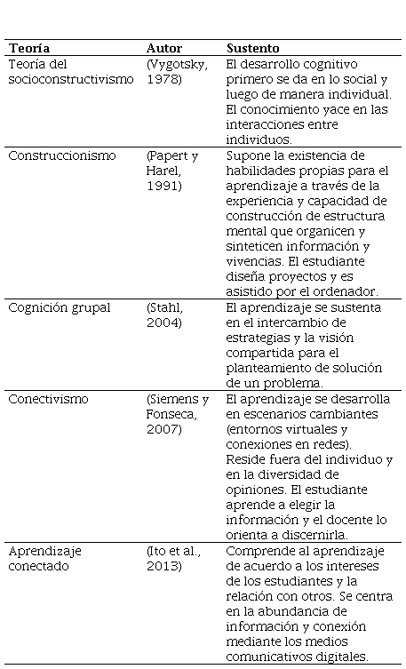 Luego de revisar los modelos que dan sustento al DTP-AIEC, se identificaron las principales teorías que dan sustento pedagógico a la propuesta (Tabla 3).