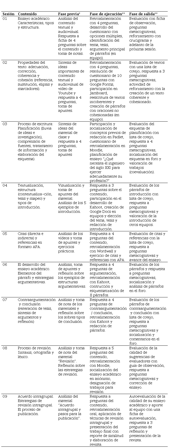 Se ha elaborado una guía de 09 sesiones de aprendizaje sobre el contenido del ensayo académico con la aplicación del DTP-AIEC (Tabla 4).