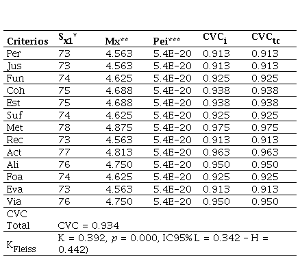 La concordancia entre jueces es alta (CVC > 0.90) en todos los criterios (Tabla 5). Además, la valoración entre tales criterios presenta concordancia significativa y aceptable (p > 0.05, k > 0.3). Por tanto, es posible afirmar que el DTP-AIEC evidencia una validez de contenido adecuada y presenta las condiciones para la ejecución en el grupo experimental.