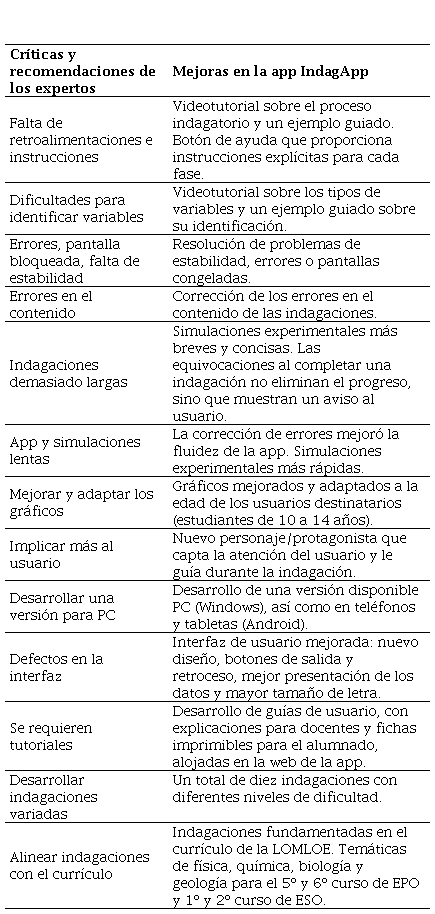En la Tabla 1 se muestran los códigos generados a partir del análisis cualitativo, junto con las mejoras implementadas en IndagApp con base en las opiniones y sugerencias de los expertos.