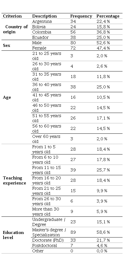The selected sample consisted of 152 university professors who participated on a voluntary basis and at the moment of data collection worked in higher education institutions in Argentina (22.4 %), Bolivia (15.8 %), Colombia (36.8 %) and Ecuador (25.0 %). Due to the nature of self-selection sampling, the sample reveals significant diversity in terms of geographic origin, with many participants from Colombia and Ecuador. In terms of gender, there is an even distribution between men and women. The age of the respondents varies widely, although the majority are in the range of 36 to 55 years old. Regarding teaching experience, there is a relatively even distribution among the different ranges of experience, with a significant percentage of participants with more than 10 years of experience. In terms of educational level, the majority have at least a master’s degree, reflecting a highly qualified and diverse educational group. As shown in Table 1, the sample has varied profiles in terms of gender, age, years of experience and educational level. This not only provides a more complete representation of the target population, but the analysis can better capture the possible influences of these demographic variables on the results, allowing for a deeper and more accurate understanding of the phenomenon studied.