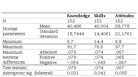 The data collected were analyzed using descriptive and inferential statistics with the help of the SPSS program (V.22.0). The domains: skills, knowledge and attitudes were elaborated from the raw scores (arithmetic sum of the items corresponding to the competencies of each dimension identified) and converted into percentage ratios.