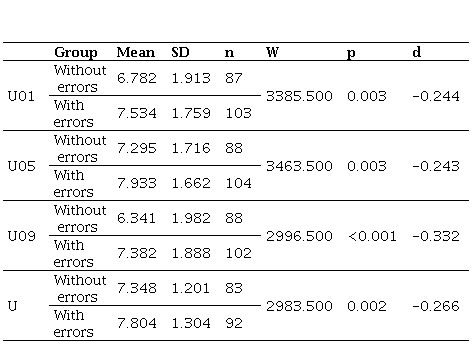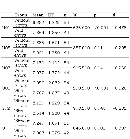 In this case (see Table 7), significant differences were found in five items: the three previously mentioned related to usefulness for memorisation (U01), learning (U05), and interest (U09), as well as two additional items concerning AI’s ability to adapt to the student’s learning pace (U07) and satisfaction with the resource despite its limitations (S02). With regard to the scalar scores, as with the full sample, significant differences were found in the dimension of usefulness. In all cases, students with errors recorded in their sessions rated the example-generating machines more positively.